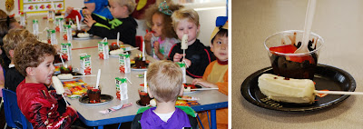 Calvin had his school Halloween party and decided on his Iron Man constume for this one. I made chocolate covered bananas, I got the idea from my friend Mary, however that was easier said then done. As many of you know, cooking is not my forte, but I usually count on my artistic skills to get me by with stuff like this. What I did learn though, is cooking is a science and a+b does not = c. Meaning, the most important thing you can know about dipping things in chocolate: DO NOT ADD WATER. Water makes ghost bananas look like furry monster bananas. So I think I ended up with like 5 smooth ghosty ones, and the rest were monsters.